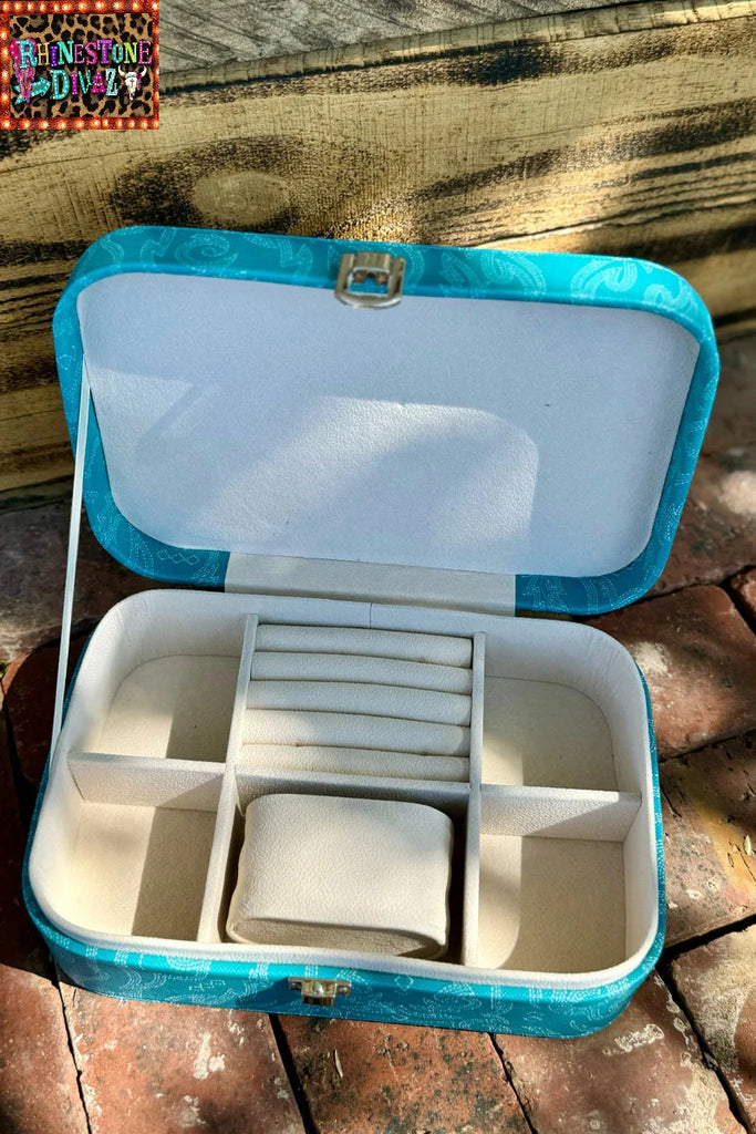 Treat your jewelry like a true cowgirl with our COWGIRL UP JEWELRY BOX. Made with a turquoise boot stitch design, it brings a touch of the wild west to your vanity. Keep your favorite pieces organized and secure in this unique and stylish jewelry box.
