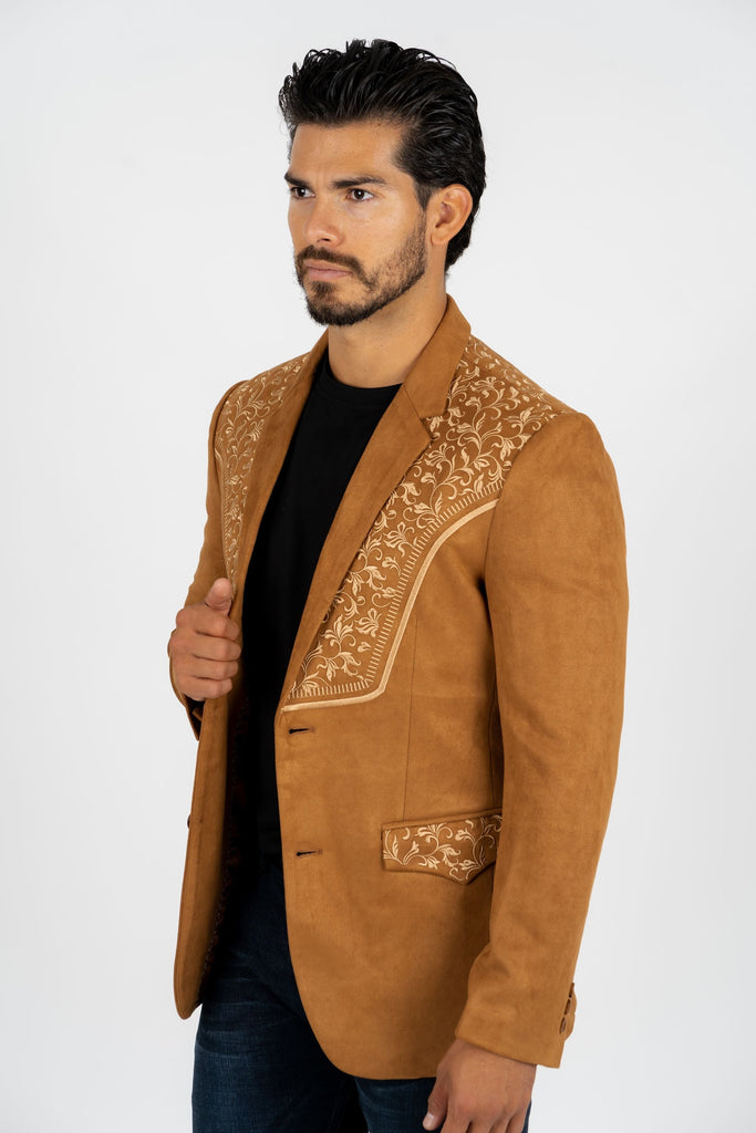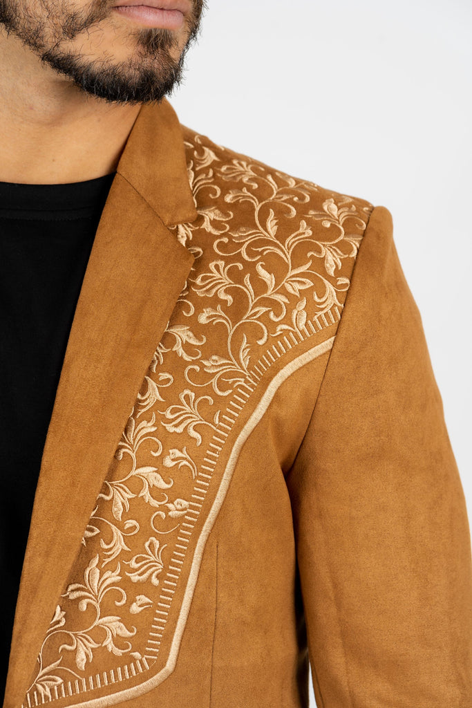 Men's Camel Embroidered Faux-Suede Blazer